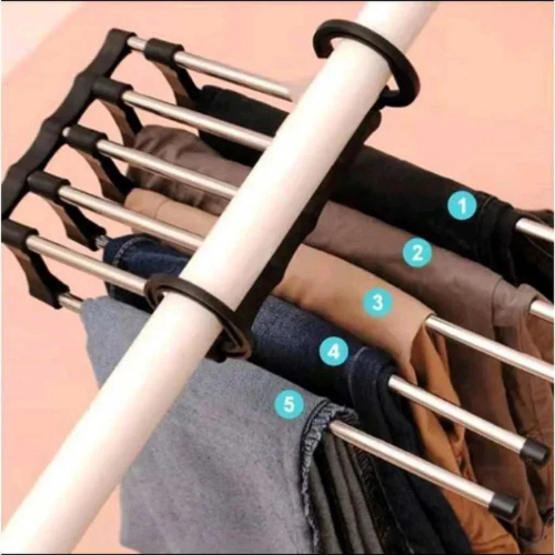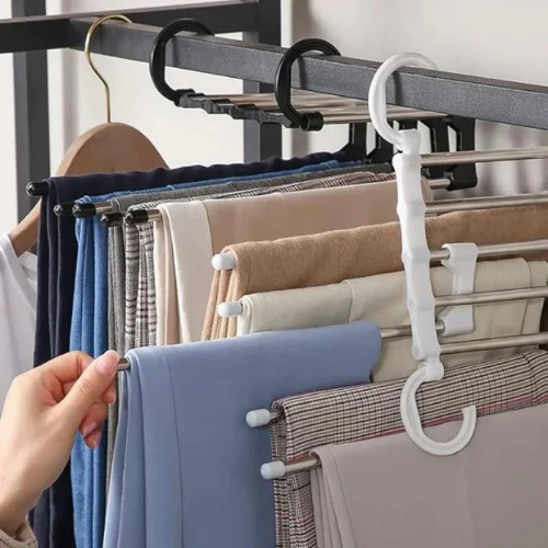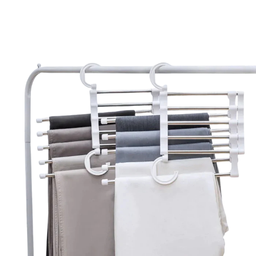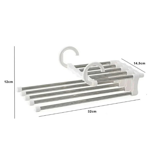 Cada percha cuenta con 5 barras resistentes, perfectas para colgar pantalones, camisas, bufandas, toallas y más. Puedes usarla en posición horizontal o vertical según el espacio disponible.